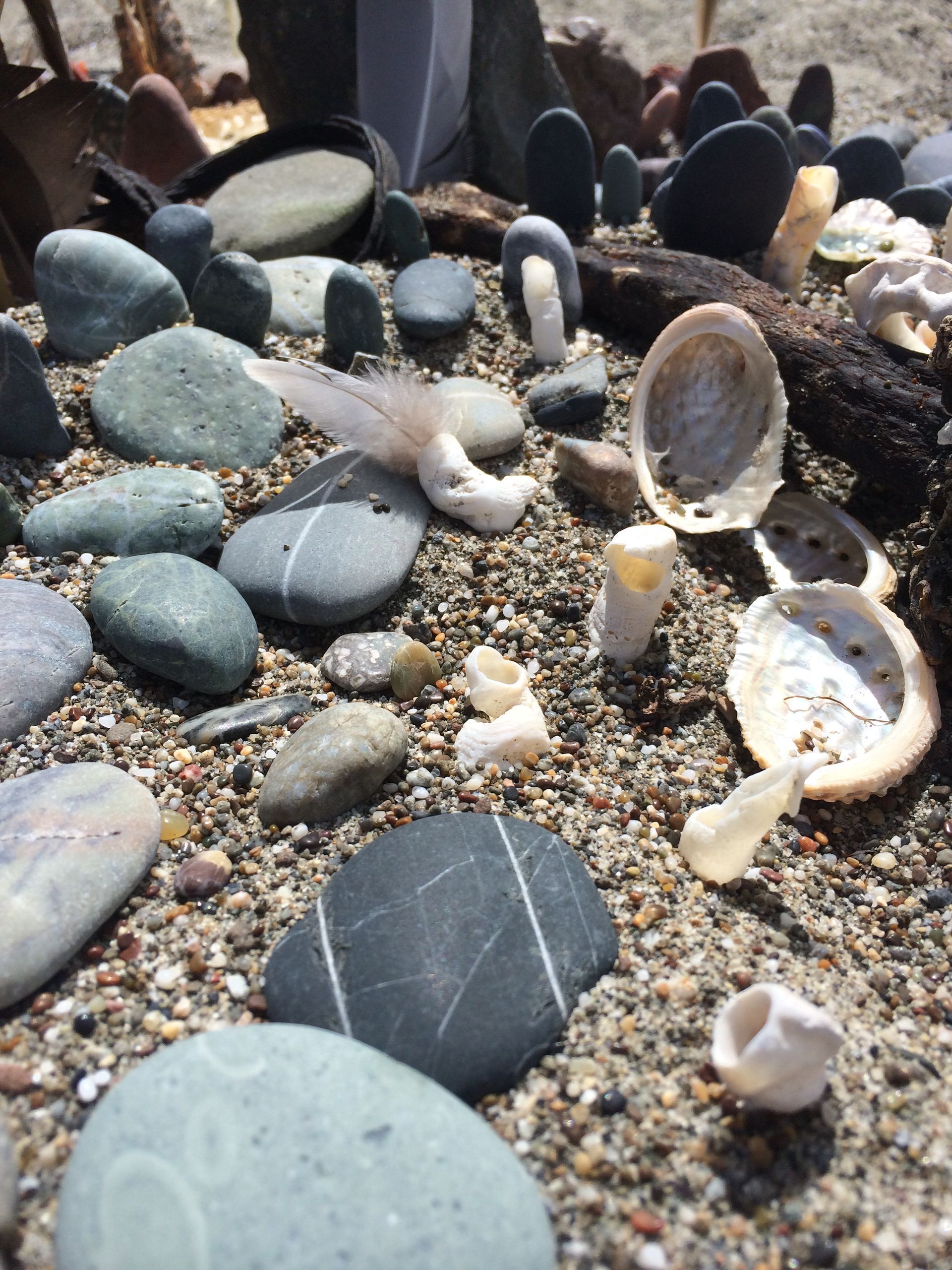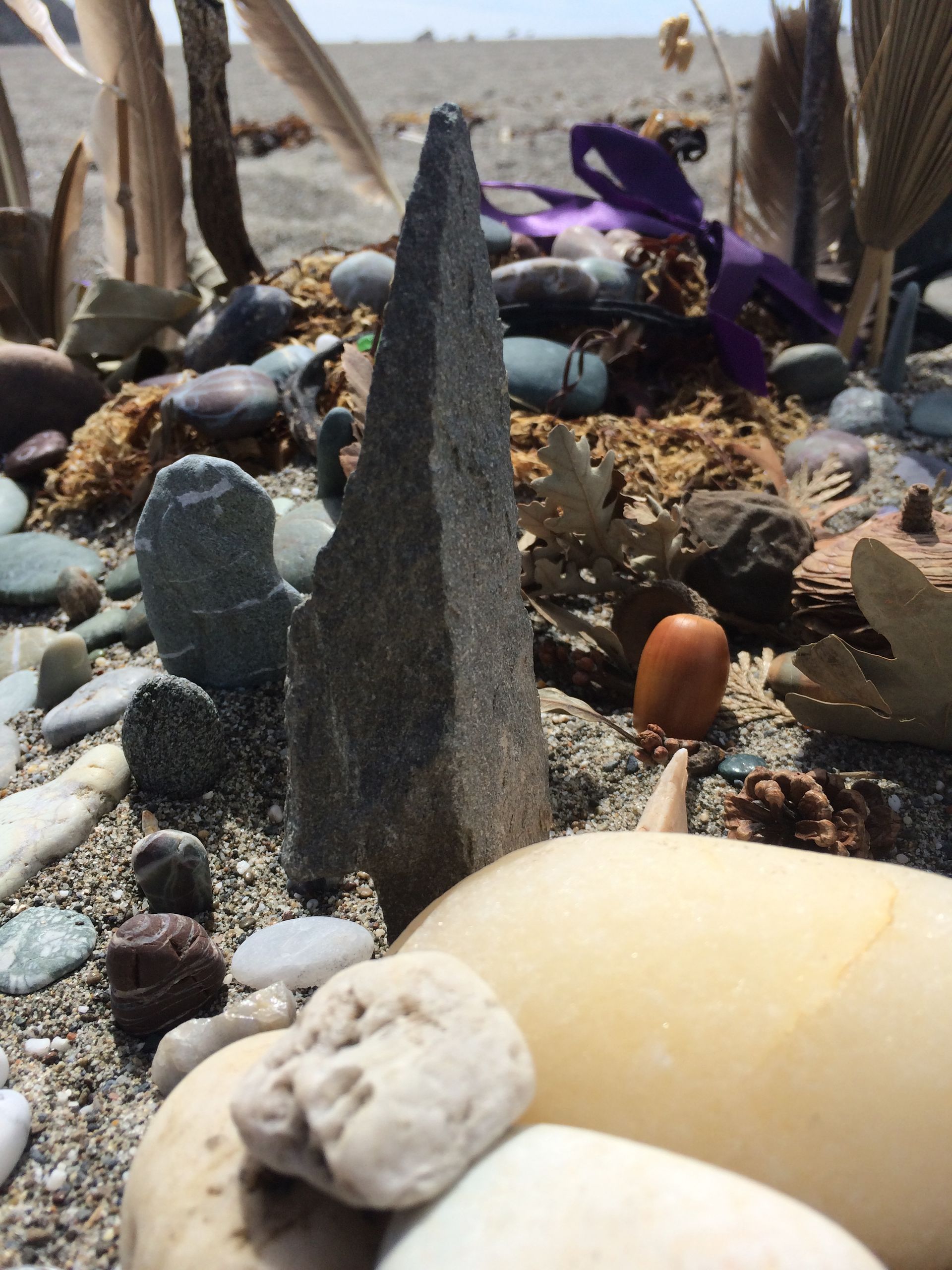 In August of 2014, Marilyn Larson and I drove North to the mouth of Navarro River Redwoods State Park in Mendocino County. We went with the intention of returning stones, shells, feathers and sticks collected over the years to the Earth.